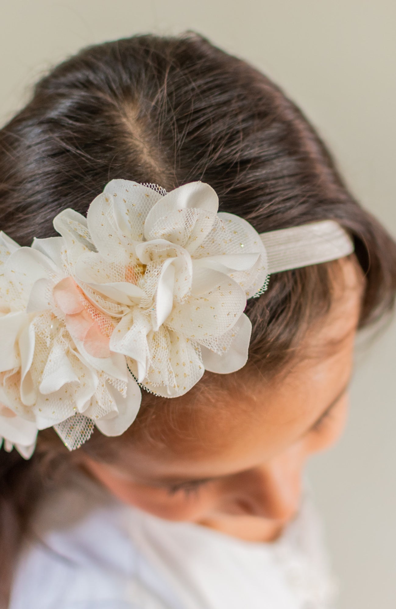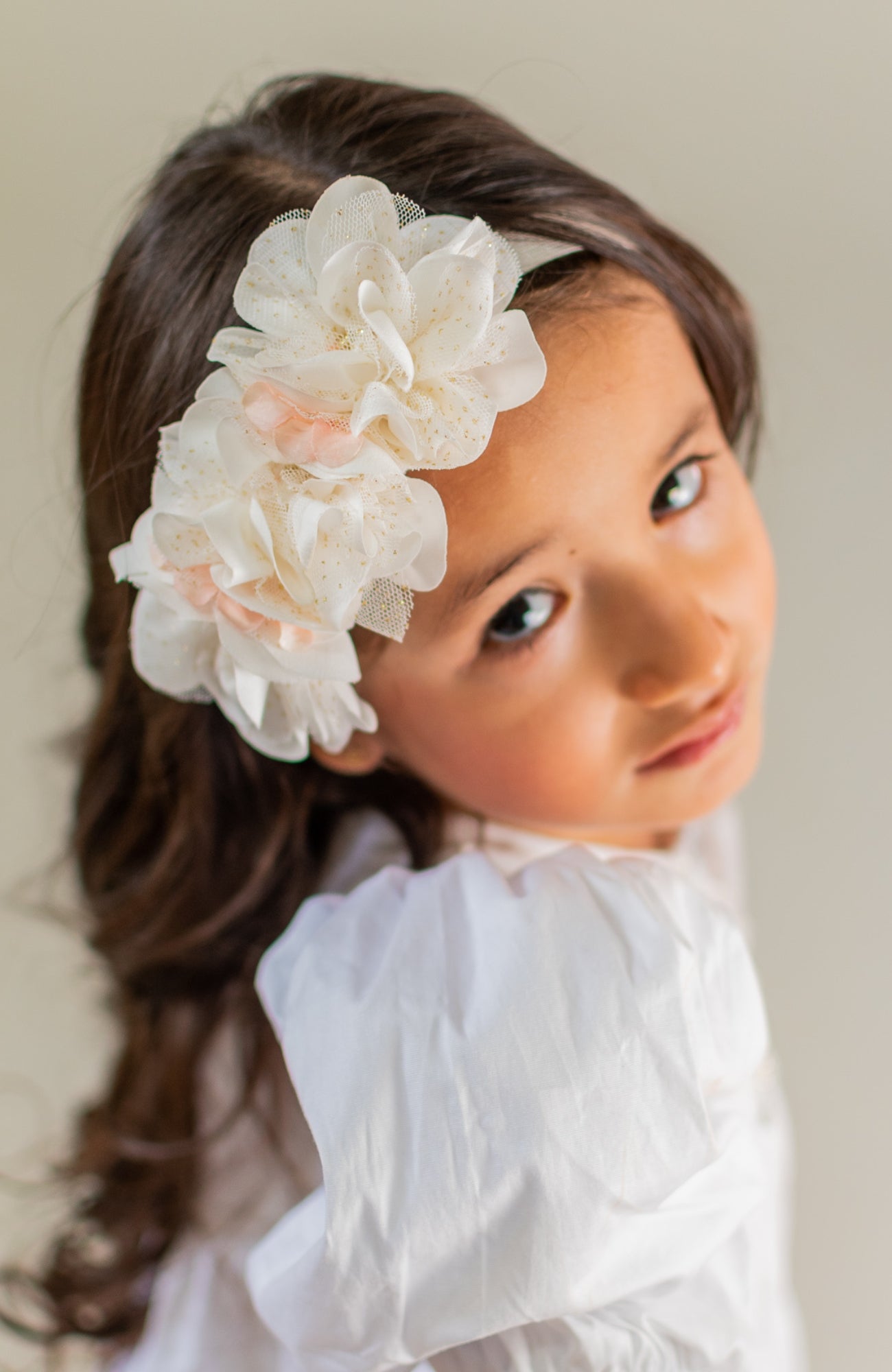 Balaca para las más pequeñas elaborada en cinta elástica y decorada con flores de tela, cintas, tulles y perlas.