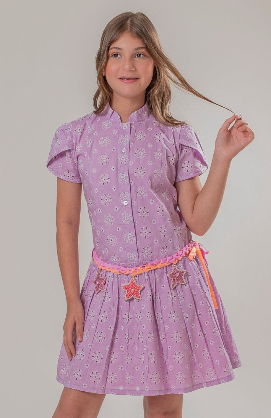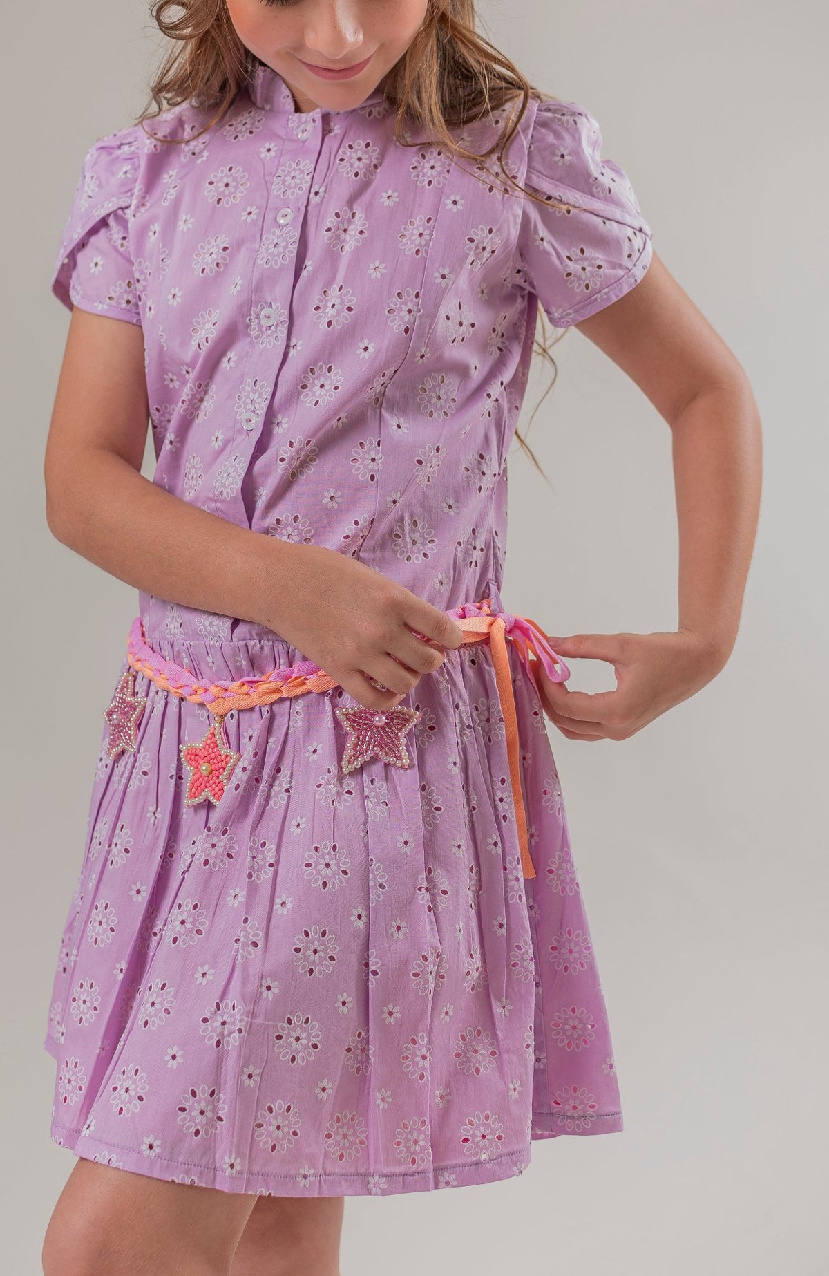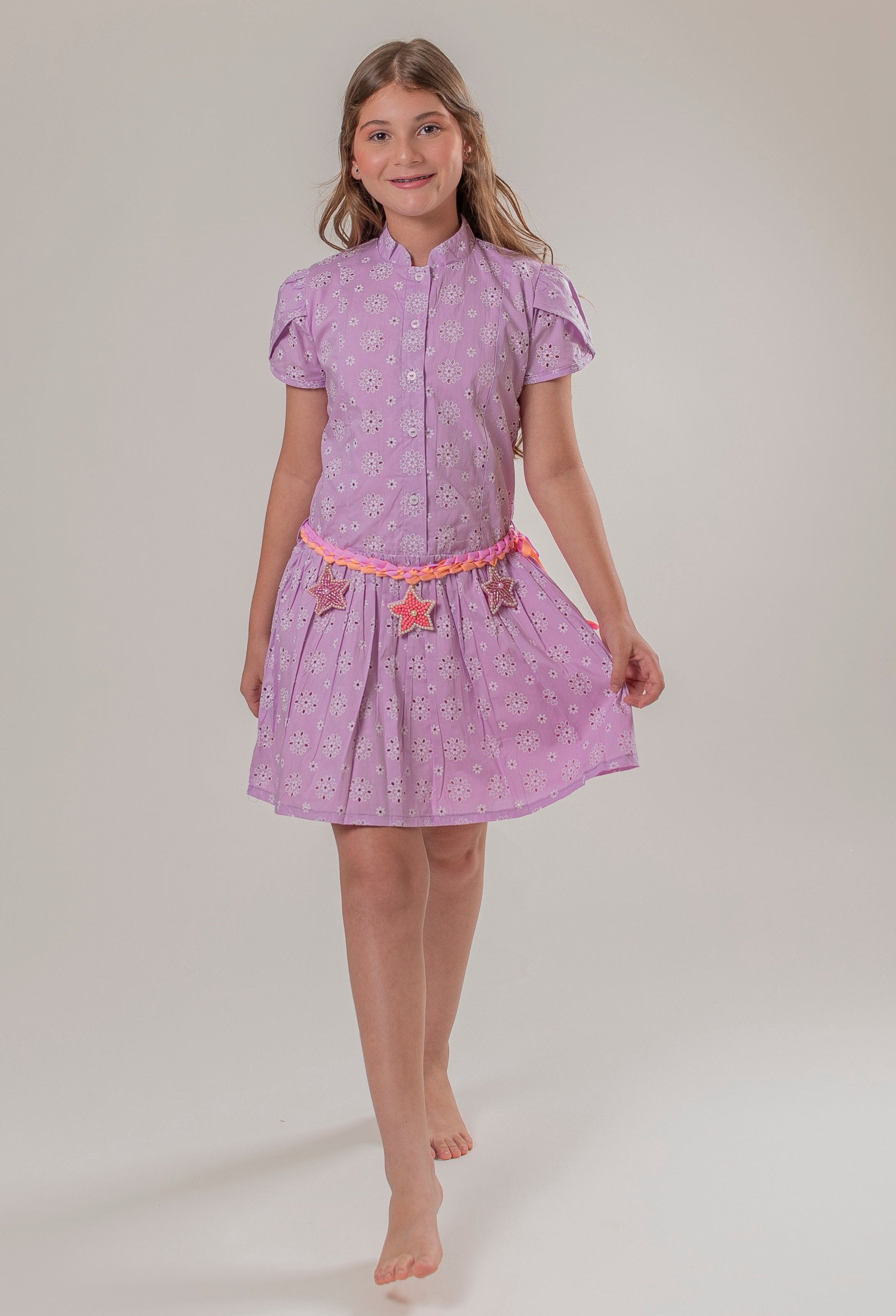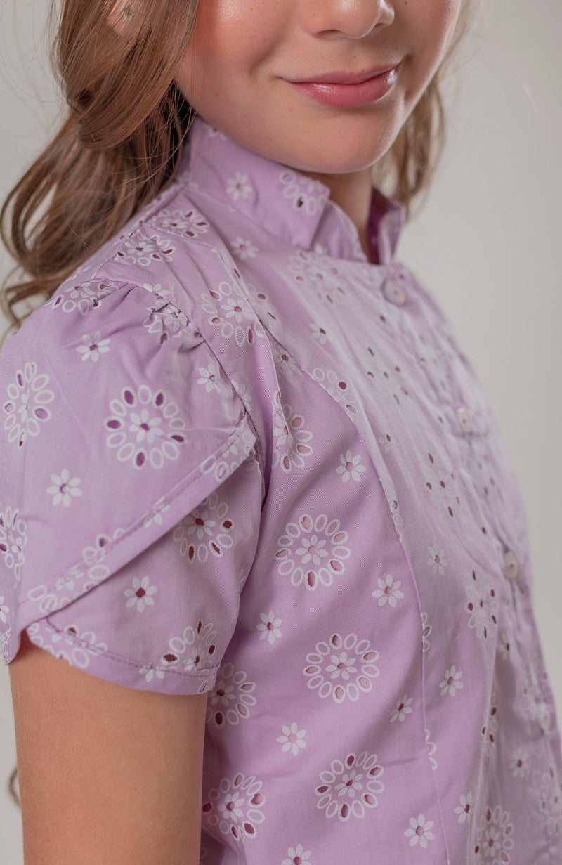Este hermoso vestido para niña en color lila es la elección perfecta para pequeñas que desean brillar en cualquier ocasión. Con un delicado diseño en ojalillo, el vestido presenta mangas que añaden un toque de elegancia y frescura. Los botones estratégicamente colocados no solo son funcionales, sino que también aportan un detalle encantador.