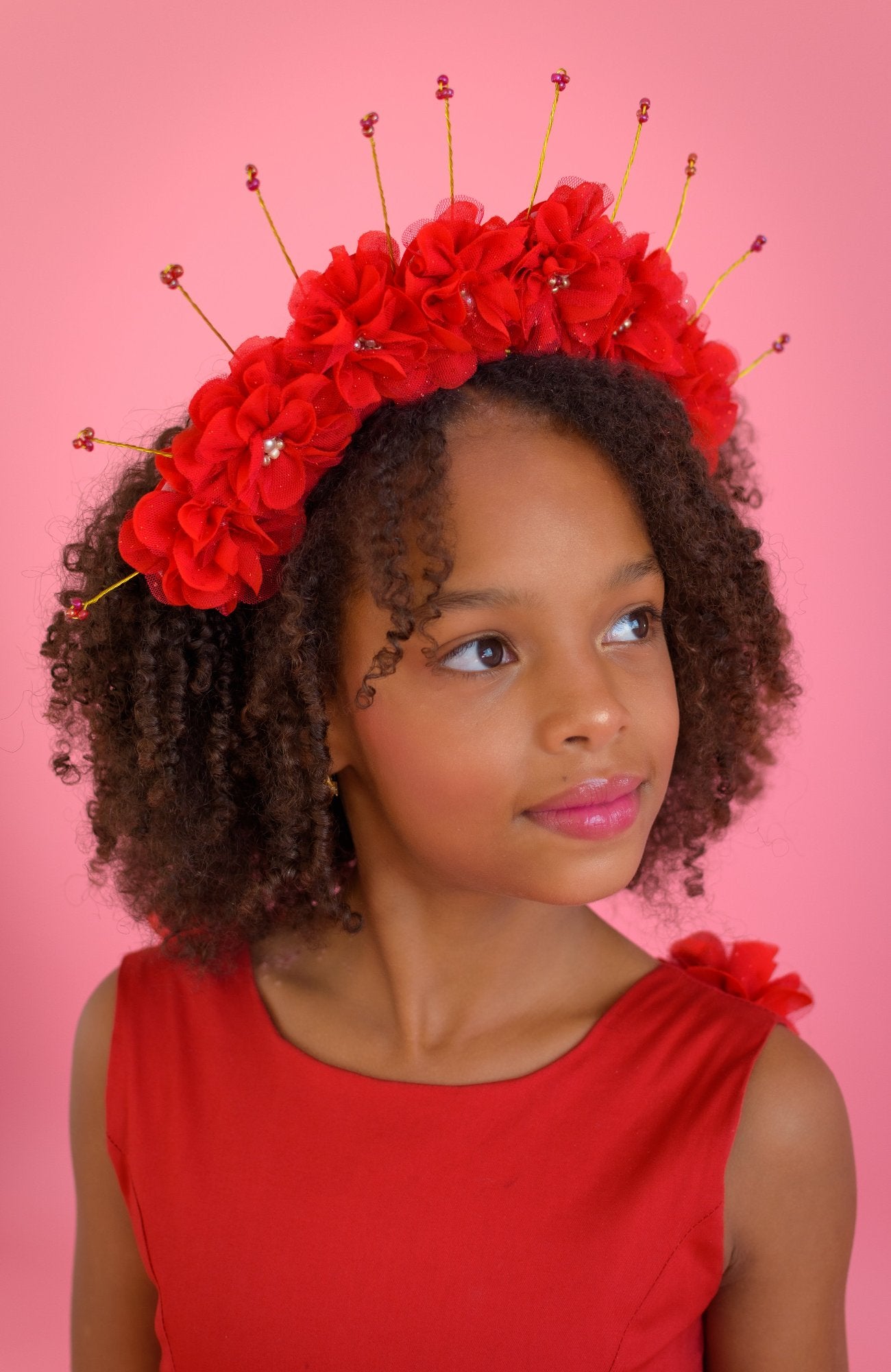 Diadema tipo Corona elaborada con alambre y flores de telas decorada y perlas, forrada en cinta.