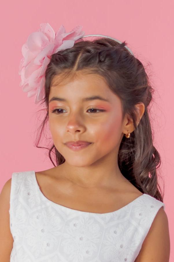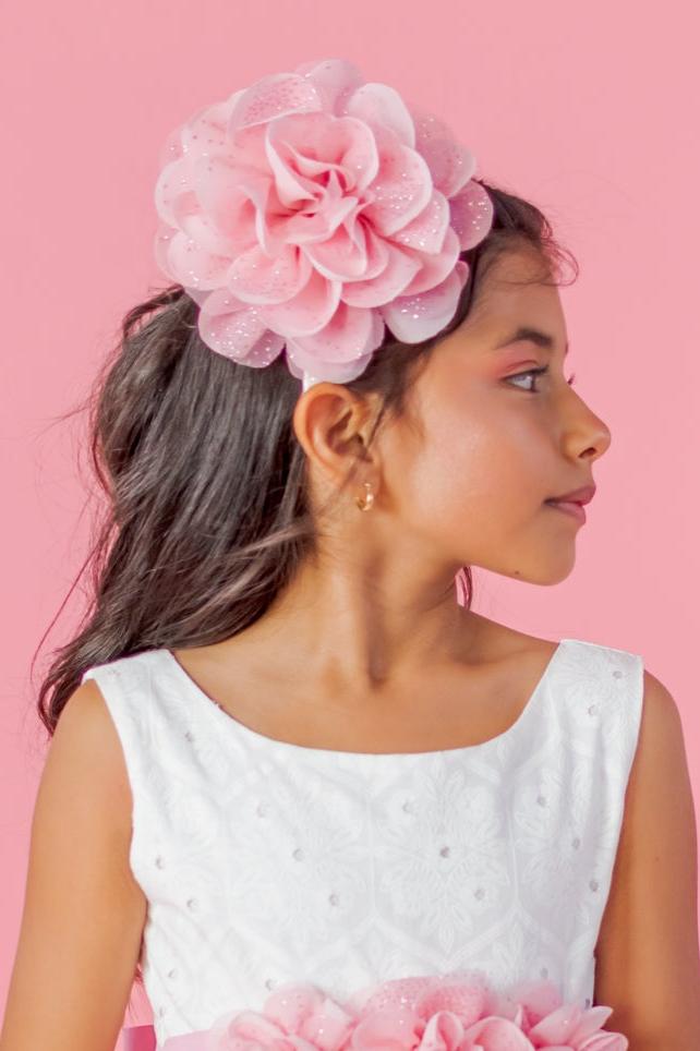Diadema tipo Corona elaborada con alambre y flores de telas decorada con tules brillantes y perlas, forrada en cinta.
