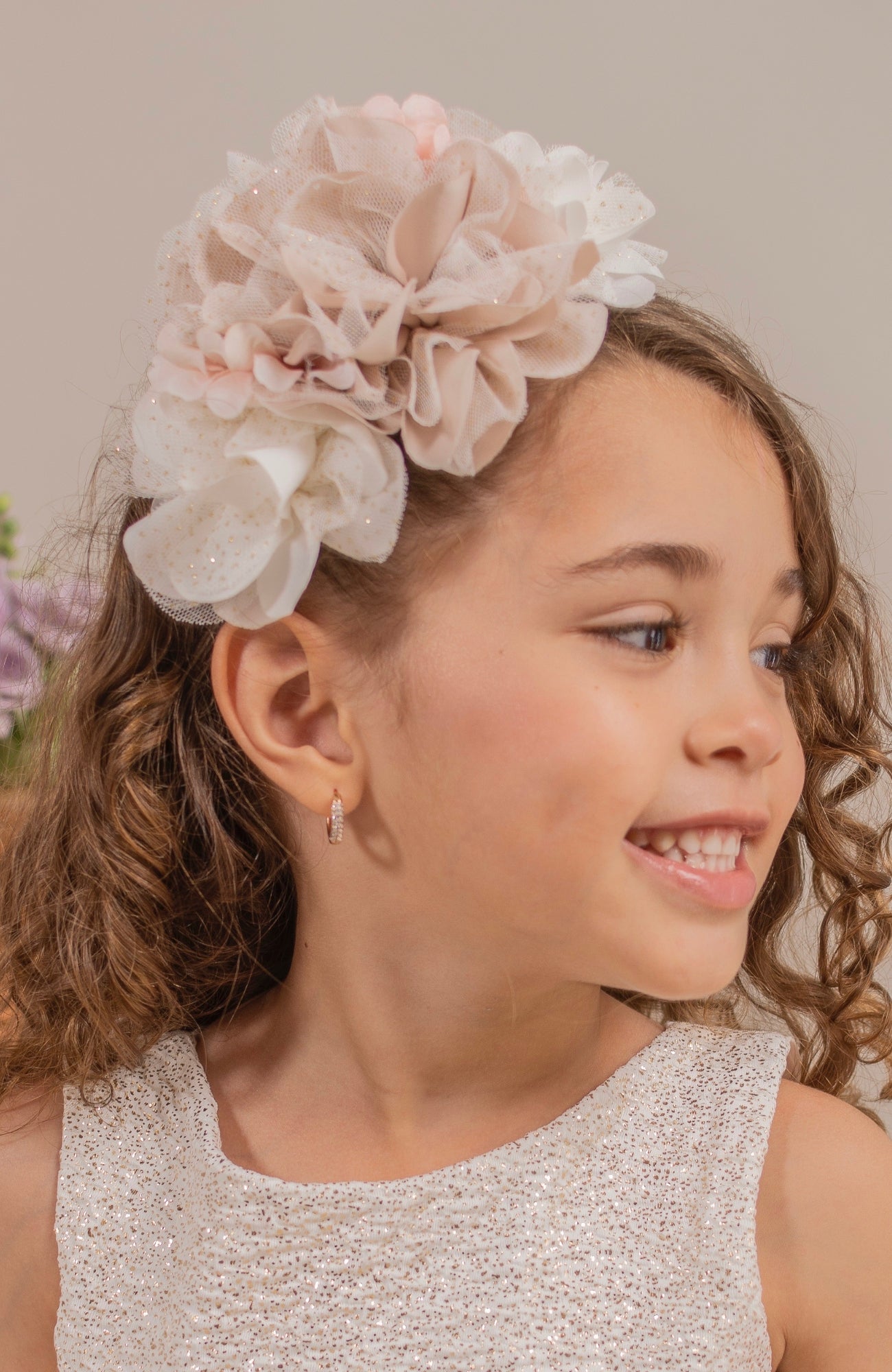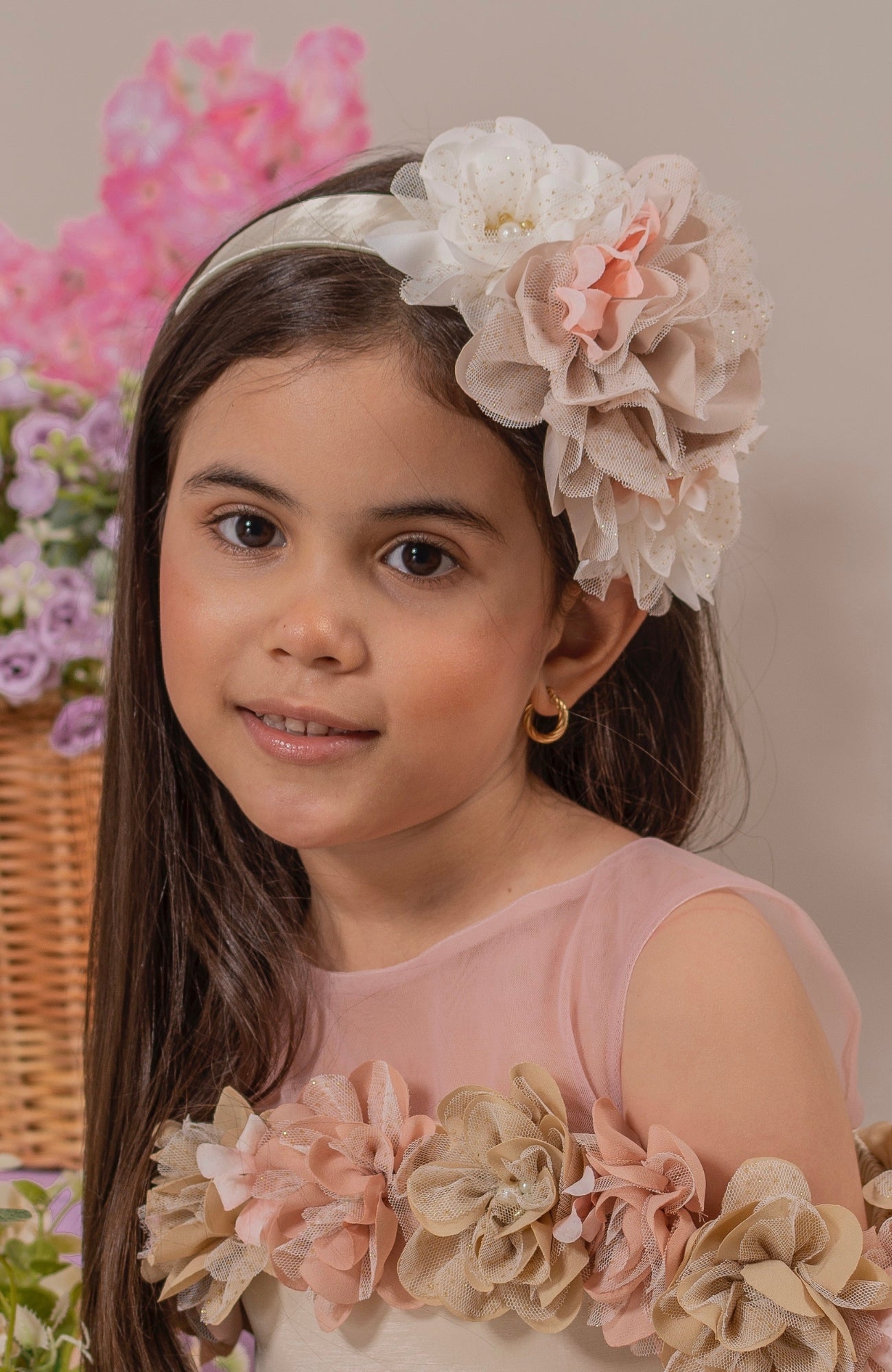 Diadema ó Vincha elaborada con flores de diferentes telas y tules y decorada con perlas, forrada en cinta.
